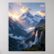 Behold nature’s grand masterpiece: a panoramic vista of colossal, snow-capped mountains under a sky painted with the colors of dawn. A brilliant sunburst pierces the clouds, while below, a majestic waterfall tumbles into a valley shrouded in soft mist. This is more than a photo; it’s an experience of pure, untamed beauty. Ideal for large-format prints, corporate offices, or any space needing a touch of awe-inspiring grandeur.