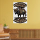Un buffle mécanique est posé sur une plate-forme, ornée de engrenages et de tuyaux.
