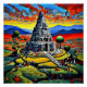 A.I. assisted print of the sun setting beneath clouds behind a spiralling stone tower standing prominently amidst a colourful landscape of hills and trees as worshippers complete the building of a stone temple to their god.
