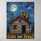 Cette oeuvre captivante capture un raton laveur avec ses marques caractéristiques assis sur le toit en bardeaux de bois d'un cabine en rondins douillet. L'arrière - plan est un ciel nocturne plein de vitalité et texturé avec une grande lune brillante. Les arbres environnants sont rongés et nus, ajoutant à l'atmosphère rustique et sauvage. Le texte en gras "mignon mais ferreux" ajoute une touche de personnalité à la scène.