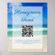Une belle photo de vagues océaniques décore l'affiche de ce fonds de lune de miel pour mariage moderne de destination. Jolie écriture cursive bleue sur la photographie tropicale au bord de la mer pour votre panneau de mariage sur la plage.