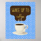 Cette affiche présente une tasse de café chaude sur fond de carreaux de mosaïque traditionnelle bleus. Le design intemporel dégage chaleur et confort, ce qui en fait un complément élégant à votre cuisine, salle à manger, comptoir de petit-déjeuner, café ou encore des vitrines de bureau. Le slogan simple mais puissant, "Réveillez-vous au café" résonne aux amateurs de café, inspirant un début rafraîchissant à la journée.