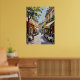 Ce tableau représente une scène de rue européenne animée, où cafés et dîners débordent sur la rue pavée. L'oeuvre a un style d'impasto texturé et dynamique, avec des coups de pinceau visibles qui créent un sentiment d'énergie et de mouvement. Les gens sont assis à des tables sous des auvents rouges et beiges, tandis que d'autres se promènent dans la rue. Les grands bâtiments avec balcons et l'atmosphère ensoleillée donnent à la scène un charme européen classique et animé.