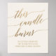 Ce signe élégant de calligraphie dorée ivoire "cette bougie brûle" est parfait pour un mariage simple. Le design neutre présente un poster minimaliste orné d'une typographie romantique et fantaisiste en faux feuillet doré.