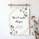 Cette calligraphie géométrique or cette bougie brûle le signe est parfait pour un mariage rustique. Le design présente des branches d'eucalyptus vert botanique dessinées à la main et des feuilles ornant un élégant cadre géométrique.