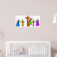Dessin d'un petit enfant qui tient la croix de Pâques du calvaire et deux autres enfants qui tiennent les voleurs croisent de chaque côté.