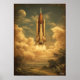 A mid-century retro vintage illustration of a rocket launch at Cape Canaveral, inspired by classic space exploration posters. Warm golden tones, soft textures, and a nostalgic atmosphere evoke the optimism of early space travel. This artwork celebrates human exploration and retro futurism, bringing iconic space history and timeless design to mid-century modern and vintage-inspired interiors.