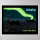 Deux caribous de taureau (Rangifer tarandus), c'est-à-dire des rennes, marchent la nuit dans la toundra pendant qu'ils migrent vers le sud pour l'hiver. Le givre est sur le sol et les aurores boréales brillent au-dessus de montagnes lointaines. Texte "Alaska" apparaît en bleu et blanc brillant Ajouter votre propre texte supplémentaire.