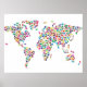 Une carte du monde faite de silhouettes colorées de chats sur un arrière - plan blanc.