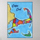 Carte colorée et amusante dessinée à la main montrant les villes de Cape Cod, Martha's Vineyard et Nantucket. Une affiche unique pour tous ceux qui aiment passer l'été dans ces lieux de vacances populaires.