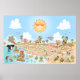 Vue lunatique et détaillée de la Californie du Sud - avec Los Angeles, Anaheim, Long Beach, San Diego et d'autres grandes villes plus la plupart des villes de plage - des personnages zany jouent sur la plage et le désert, les montagnes et les vallées. Cette scène pleine de charme a tout - un surfeur pend dix tandis qu'une sirène fait des salons sur un rocher, qu'une baleine tueuse saute de l'eau alors qu'un t-rex lance un défi, qu'un couple de plage musclé flex to impress, que des animaux de zoo attendent les touristes et qu'un taureau frappe dans un chasseur de taureaux...