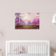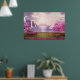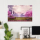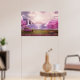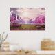 Poster avec l'image pittoresque d'un lac violet paisible. Entouré de cerisiers luxuriants et de cascades.