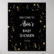 Ce panneau d'accueil Gold Celebration on Black Baby shower est parfait pour un baby shower élégant et neutre pour les femmes. Le design moderne présente des décorations en faux or sur un arrière - plan noir avec une élégante calligraphie blanche. Customisez-le pour un bébé sprinkle, une soirée révélatrice de sexe ou une fête de premier anniversaire.