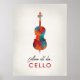 Un design Cello lumineux et coloré qui dit "Surtout... Cello". Couleurs chaudes de rouge, orange, turquoise et aqua dans un motif de style aquarelle sur un arrière - plan neutre.