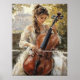 A young blonde woman in a flowing dress plays a cello gracefully, captured in soft, impressionistic brushstrokes evoking timeless elegance and musical passion.