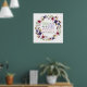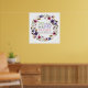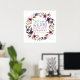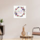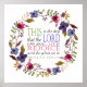 Une couronne fleurie avec des délicates fleurs violettes rouges profondes et des fleurs bleues profondes. Dans le cercle se trouve le verset du Psaume 118:24 "C'est le jour que le Seigneur a fait. réjouissons-nous et réjouissons-nous"