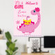C'est une fille qui éclose bientôt maman dinosaure rose avec le signe de bienvenue du baby shower d'oeufs de dino d'éclosion.