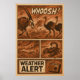 Cette bande dessinée de style vintage intitulée "Alerte météorologique" délivre une scène intense d'une tempête de désert avec des animaux qui se bousculent pour survivre. Une antilope et des autruches fuient tandis que les vents tourbillonnants et les débris créent le chaos, tandis qu'un scorpion émerge de la poussière. Le design comporte un texte en gras comme "WHOOSH !" et un avertissement radio dramatique, qui saisit parfaitement l'urgence des catastrophes naturelles. Avec sa palette grasse et rouge et sa mise en page comique rétro, cette pièce est idéale pour les amateurs de bandes dessinées animalières, de créatures désertiques et d'illustrations dramatiques de l'environnement.