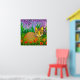 Poster dans un mignon chat gingembre aux yeux verts, allongé dans un jardin d'été de maîtres rouges et de jacinthes violets