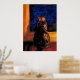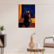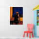 Cette affiche présente un magnifique chat en enfer de tortue doré, orange et marron assis sur un coussin rouge, regardant par la fenêtre dans un ciel bleu nuit. Elle projette une ombre sur le rebord en bois doré. J'ai numériquement amélioré ma photo originale pour obtenir un effet peintre.