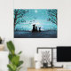 Deux chiens et chats en silhouette qui observent le coucher du soleil pendant une soirée d'hiver. Dans les couleurs bleu, noir et blanc. Avec deux arbres de part et d'autre et des oiseaux volant vers le coucher du soleil. Des flocons de neige tombent et quelques étoiles brillantes dans le ciel. Paysage hivernal Peinture acrylique originale réalisée par Donna Leger pour Irony Designs. Tous droits réservés