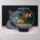 Un beau chat aux cheveux longs gris bleu russe regarde intensément dans un bol rond de poisson rouge. Il a un oeil et un visage magnifiés en regardant le poisson. Le poisson rouge a l'air surpris en nageant au-dessus des nombreux petits galets colorés.