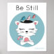 Une illustration adorable et colorée d'un chat méditant avec des papillons flottant de sa tête - un rappel d'être attentif, penser des pensées positives, et lâcher prise de ce qui ne nous sert plus. Le design comporte également le dicton inspirant, "Soyez immobiles".