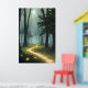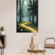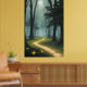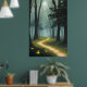 L'image représente un chemin sinueux à travers une forêt dense et mystique. De grands arbres foncés bordent le chemin, leurs branches se dirigeant vers un ciel brumeux et éthéré. Le sentier est éclairé par une lumière douce et dorée, projetant de longues ombres sur le sous-bois vert luxuriant. Parsemés le long du sentier sont des papillons jaunes et brillants, ajoutant une touche de magie à la scène.