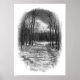 Cette affiche présente une scène hivernale en noir et blanc. Un long sentier enneigé mène de la forêt à un étang glacé qui est recouvert de neige. Des troncs d'arbre noir nus encadrent l'image. Un ciel gris spectaculaire avec des nuages blancs éclatants illumine la clairière lointaine.