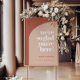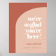 Nous sommes si heureux que vous soyez ici signe mariage : une affiche simple pour accueillir vos invités. Minimaliste mais frappant : adoptez ce design typographique légèrement rétro et élégant pour votre papeterie mariage, avec un design moderne en arc et des couleurs en terre cuite et orange brûlé. Texte, couleurs et arrière - plans entièrement personnalisables.