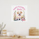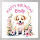 Chien chiot mignon assis dans des fleurs roses bannière d'anniversaire personnalisée pour une fête d'anniversaire de petite fille.