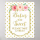 Les bébés sont sucrés s'il vous plaît prendre une gâterie faveurs ou affiche de barre de bonbons pour le baby shower en points blancs et or motif avec bordure d'or, rose rustique et pêche de l'aquarelle fleurs et de style manuscrit lettrage.