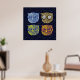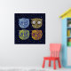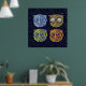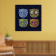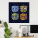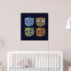 Quatre illustrations de hibou graphique dans un ciel bleu profond étoilé pour décorer vos murs de maison
