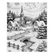 This elegant black-and-white Christmas poster features a beautifully illustrated winter village, evoking the quiet charm of a storybook scene. Delicate linework captures snow-covered rooftops, pine trees, and a winding stream beneath a stone bridge, all bathed in a soft, vintage glow. A slender church steeple watches over cozy cottages, while distant mountains fade into a dreamy horizon. The design is airy and serene, inviting warmth and nostalgia.