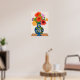 Une vie semi-abstraite numérique morte de corail orange et moutarde jaune chrysanthèmes dans un bleu foncé, style antique, vase chinois