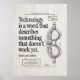 Cette oeuvre de style vintage des années 1980 combine une citation technologique classique avec un dessin de faux brevet. Le texte dit : "La technologie est un mot qui décrit quelque chose qui ne fonctionne pas encore". Une excellente idée cadeau pour les geeks, les codeurs, les pros technologiques et tous ceux qui se soucient de la façon dont la technologie change nos vies. Créé par Piotr Kowalczyk & AI © Publié le : 24.02.2024.