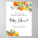 Bienvenue aux invités à votre événement avec ce signe d'accueil baby shower botanique. Il présente des illustrations d'aquarelle d'oranges, de citrons, de fleurs d'oranges et de verdure. Personnalisez en ajoutant le nom, la date, l'heure, le lieu, l'adresse et d'autres détails de l'événement. Ce panneau d'accueil aux agrumes est parfait pour les baby showers d'été et de jardin. Des éléments correspondants sont disponibles.