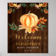Panneau de bienvenue pour baby shower avec petite citrouille orange aquarelle. Comprend une citrouille aquarelle reposant sur un lit de feuilles colorées d'automne et une police "Bienvenue" en or brillant. Personnalisez facilement et rapidement cette charmante petite affiche de bienvenue de citrouille.