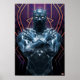 Regardez Black Panther debout, les bras croisés sur sa poitrine dans le salut Wakanda Forever, brillant dans la lumière avec un arrière - plan motif tribal violet et or.