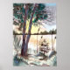 aquarelle traditionnelle d'un paysage lacustre avec deux grands arbres devant et des nuages à venir en guise d'affiche décorative.