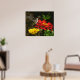 Cette affiche présente une femelle colibri à gorge rubis. Elle flotte dans l'air en buvant du nectar du centre doré d'une fleur de zinnia rouge vif. Une fleur de zinnia jaune se trouve à proximité. Les couleurs semblent brillantes contre l'arrière - plan des feuilles verts et des ombres sombres.