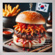 Découvrez le confort des saveurs coréennes avec ce burger Bulgogi indulgent. Une pâtisserie de boeuf juteuse, marinée dans une délicate sauce bulgogi, est surmontée d'une écharpe de kimchi piquant, d'une légère goutte de mayo gochujang, et d'une arrosée de graines de sésame croustillantes, le tout niché entre un pain de lait grillé. Un petit drapeau sud-coréen ajoute une touche de fierté coréenne, tandis que des baguettes et un côté de frites de tempura croustillantes complètent ce régal culinaire coréen.
