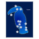 La Constellation du Toucan (Tucana) avec ses étoiles blanches accompagnées de leur lettre grecque, sur la silhouette de l'oiseau dans un dégradé de bleu.