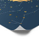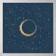 Une éclipse de lune pleine et croissante contre un ciel étoilé orné de lignes de constellations, fait en bleu indigo et or.