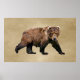 Une peinture numérique d'un ours Kodiak sur un parchemin neutre, ou vieux papier, arrière - plan. L'Ours de Kodiak (Ursus arctos middendorffi), une sous-espèce de l'ours brun, ou grizzli, est le plus grand ours du monde. Un mâle adulte peut mesurer plus de 10 mètres de haut lorsqu'il est debout sur ses pattes postérieures et peser plus de 1500 livres - un spectacle à voir. Un ours du zoo de Bismarck, dans le Dakota du Nord, aurait pesé jusqu'à 2 400 livres. Les ours vivent sur les îles de l'archipel Kodiak de l'Alaska. Aujourd'hui, il y a environ 3500 ours kodiak et leur nombre augmente en raison de l'état généralement excellent de leur habitat, y compris un poing suffisant pour se nourrir. Ils sont appelés "takuka-aq" en Alutiiq, la langue maternelle du peuple dans cette région. On pense que les ours y ont été isolés depuis la fin de la dernière ère glaciaire, il y a plus de 12 000 ans. Bien qu'ils soient le plus grand carnivore terrestre leur régime alimentaire comprend de grandes quantités d'herbe, d'autres plantes et des baies. Aujourd'hui, il y a environ 3500 ours kodiak et leur nombre augmente en raison de l'état généralement excellent de leur habitat, y compris un nombre suffisant de poissons à manger. En raison de l'abondance des ressources alimentaires, les ours Kodiak ont une aire de répartition plus petite que les autres ours bruns et n'ont pas besoin de défendre les territoires. Les Alutiiq chassaient les ours pour leur nourriture, leurs vêtements et leurs outils. Des flèches, des lances et beaucoup de courage étaient nécessaires pour la chasse. Les têtes d'ours étaient généralement laissées dans le champ comme un signe de respect de l'esprit des ours.