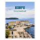 L'affiche grecque du Corfou. L'île grecque avec de belles plages entourées de palmiers est parfaite pour le prochain congé de baignade. En arrière-plan, la mer et les montagnes.