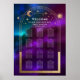 Cosmic Purple Turquoise Gold Sun Moon Stars Astronomy Mariage Seating Chart Mariage Sign Poster Prints présente soleil doré, lune et étoiles avec un cadre doré sur coloré mystique violet, turquoise et bleu arrière - plan cosmique. À l'intérieur du cadre se trouve le texte "Welcome" dans un élégant script de calligraphie blanche et vos informations personnalisées sur le plan des sièges de réception de mariage. Conçu pour vous par ©Evco Studio www.zazzle.com/store/evcostudio