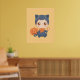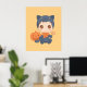L'adorable bébé habillé d'un costume de chat noir avec un gros arc orange tient une sucette avec une image crânienne. Un citrouille courbé se tient juste un peu en arrière.