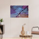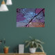 Cette affiche d'art présente un motif abstrait de branches noires contre un ciel couché de soleil aux couleurs arc-en-ciel de violet, bleu, blanc, rose, orange, gris et magenta.