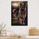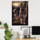 Un chien berger allemand se dresse fièrement sur fond de montagnes au lever du soleil. Le soleil se lève derrière le chien, projetant une lumière chaude sur sa fourrure. Le chien regarde directement le spectateur, avec une expression déterminée sur son visage. Ci-dessous le chien est une citation sur le courage.